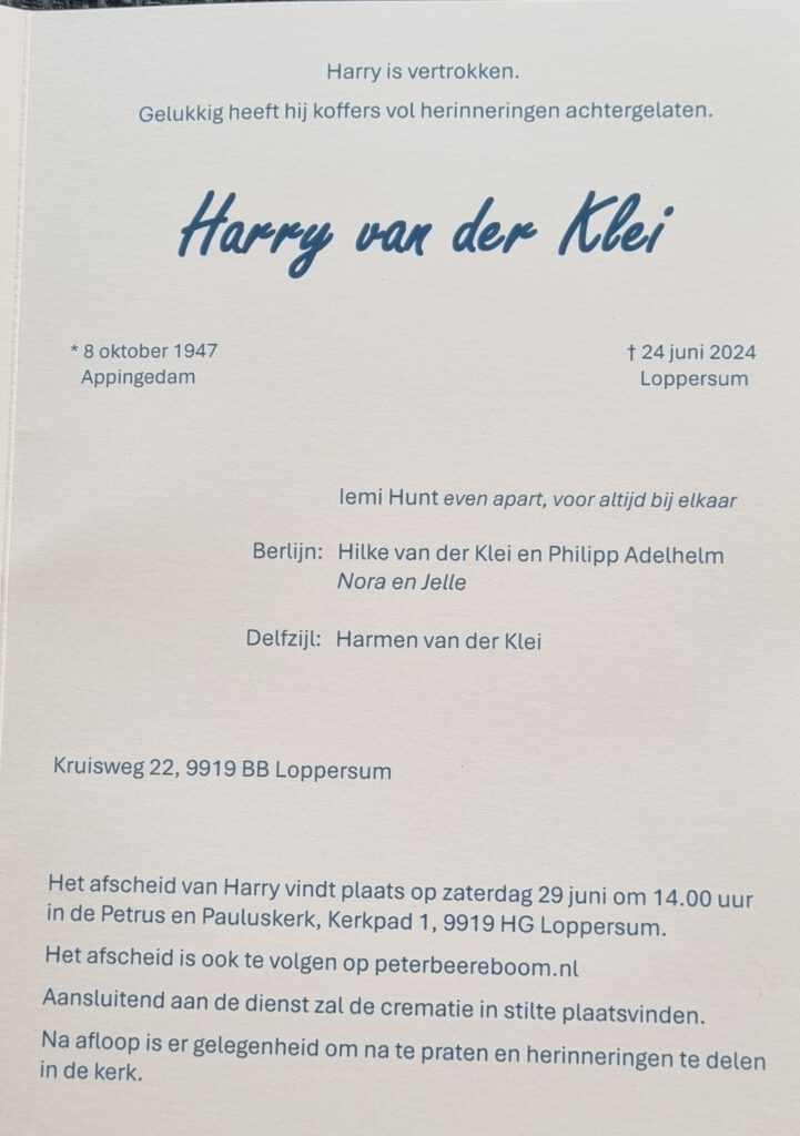 Maandag 24 juni 2024 is Harry van der Klei op 76 jarige leeftijd overleden.